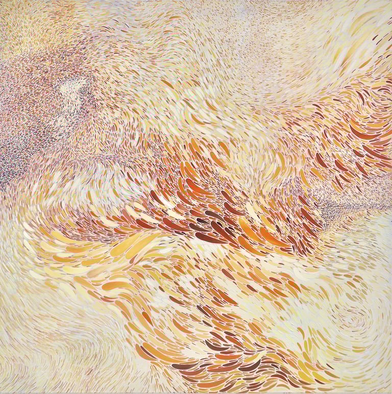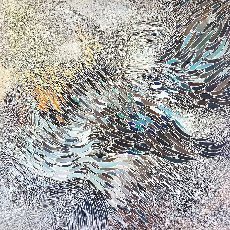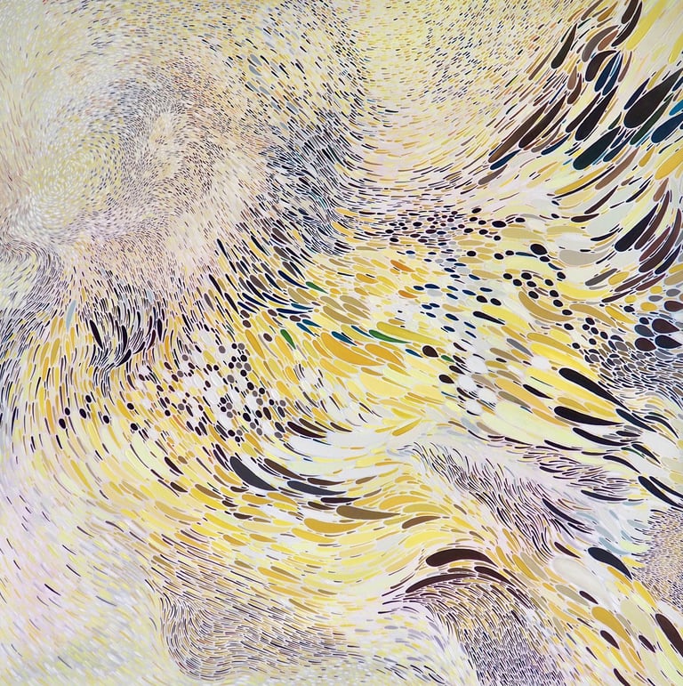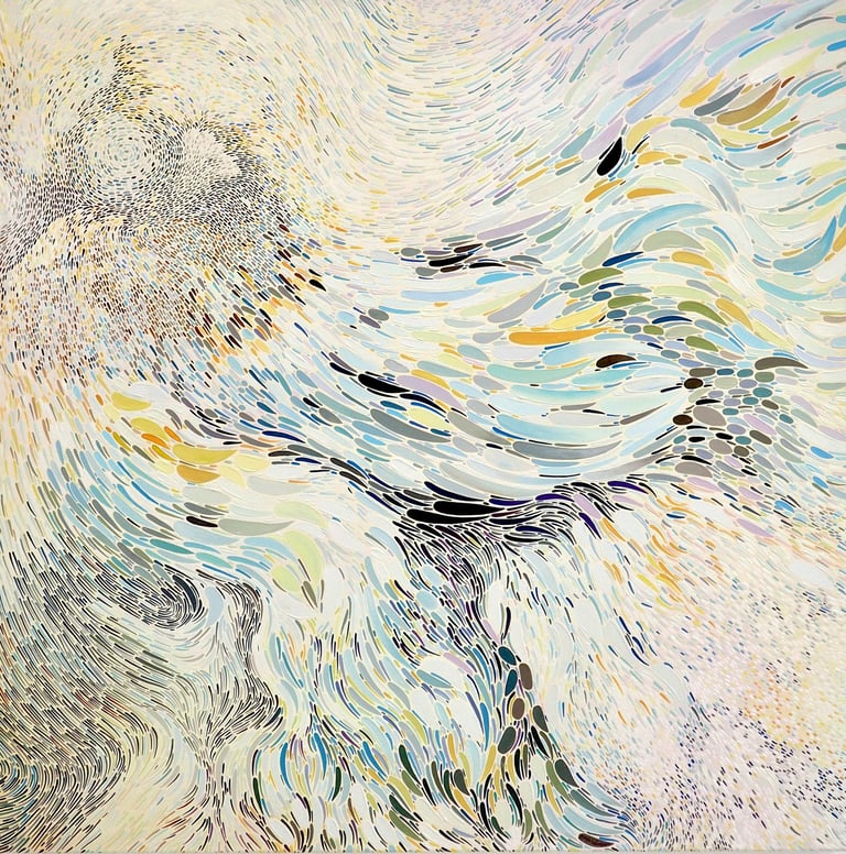 Ruby has always had a passion for fine details, primarily focusing on realism influenced by her local environment. As a chicken keeper for over a decade, she was captivated by the intricate patterns and varying shades of colours that comprise a feather, which led her to develop a more abstract style and initiate her chicken project. Exploring themes related to factory farming, Ruby enjoyed the opportunity to depict one of the worlds highest populated animals through intricate flowing lines and colour, resulting in oil paintings that reflect her vision of their beauty.